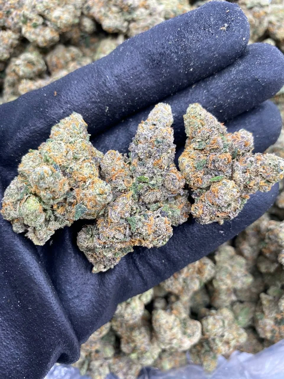 Handful of dried cannabis flowering tops (close up).